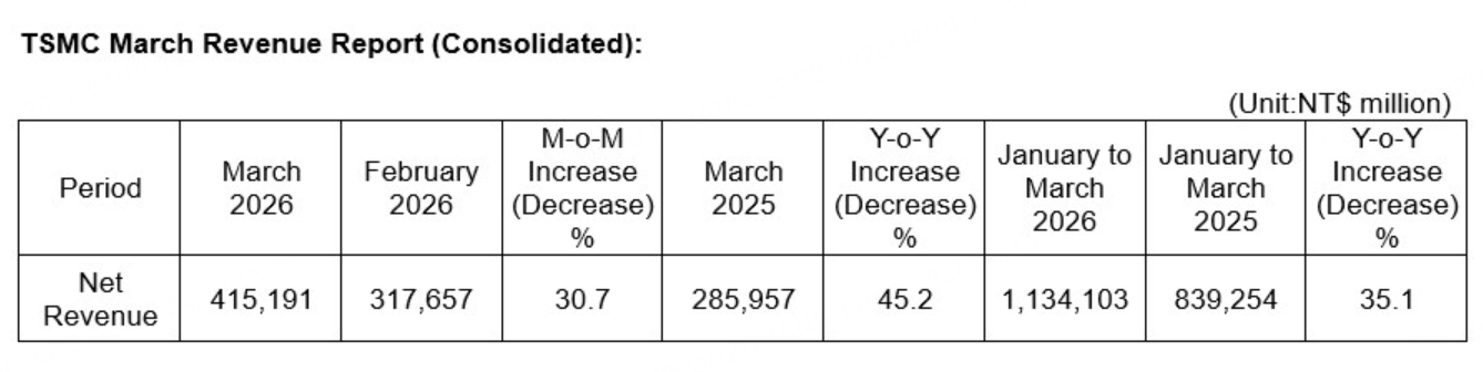台积电3月销售额4151.9亿元台币,同比增长45.2%