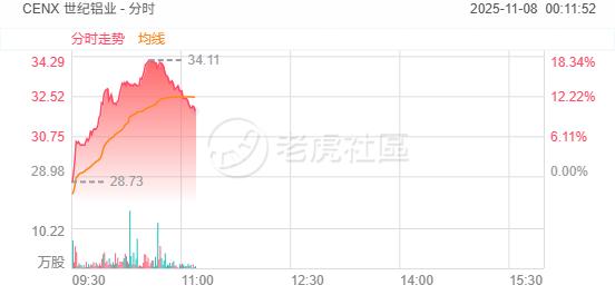 周五, 世纪铝业 盘中大涨逾17%。消息面上,11月7日,世纪铝业公布2025年第三季度业绩。财报显示,该公司三季度营收达6.322亿美元,同比增长17.3%,超出预期;调整后每股收益为0.56美元,较预期低0.28美元。