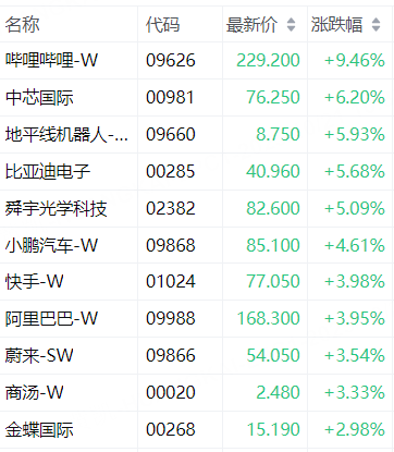 科指成分股中,哔哩哔哩-W涨超9%,中芯国际涨超6%,阿里巴巴-W涨近4%。