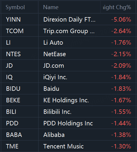 YINN fell 5.1%; Trip.com fell 2.6%; NetEase, JD.com, iQiyi, Baidu, KE Holdings and Bilibili fell 2%; PDD Holdings and Alibaba fell 1.4%; Tencent Music fell 1.3%.