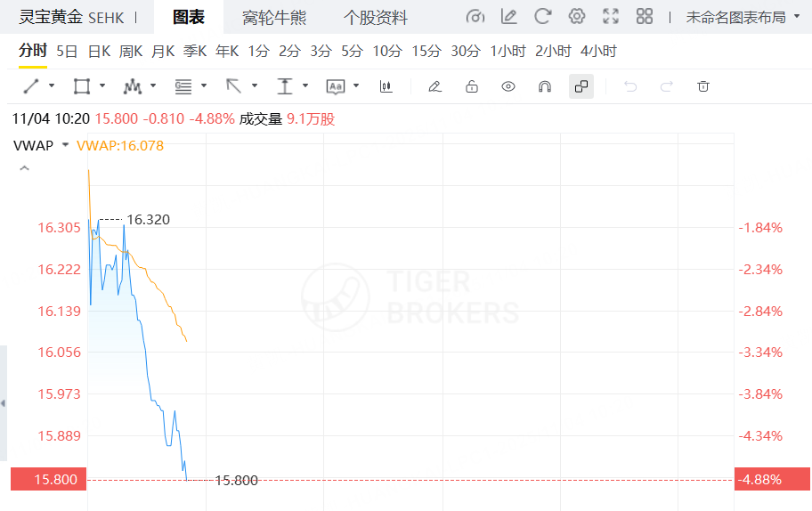 11月4日,黄金股盘中下跌,灵宝黄金跌近5%,集海资源跌超4%,紫金矿业、中国白银集团跌超3%,赤峰黄金、山东黄金、中国黄金国际跌超2%,老铺黄金跌超1%。
