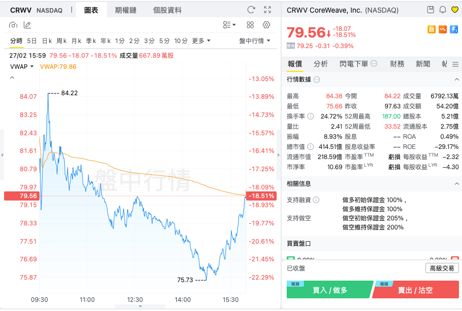 2月28日,专注人工智能算力服务的美国云端服务商 CoreWeave 最新财报表现逊于市场预期,叠加大规模资本开支计划,引发投资者担忧,股价周五收跌18.51%,盘中一度急挫22%,低见75.83美元。