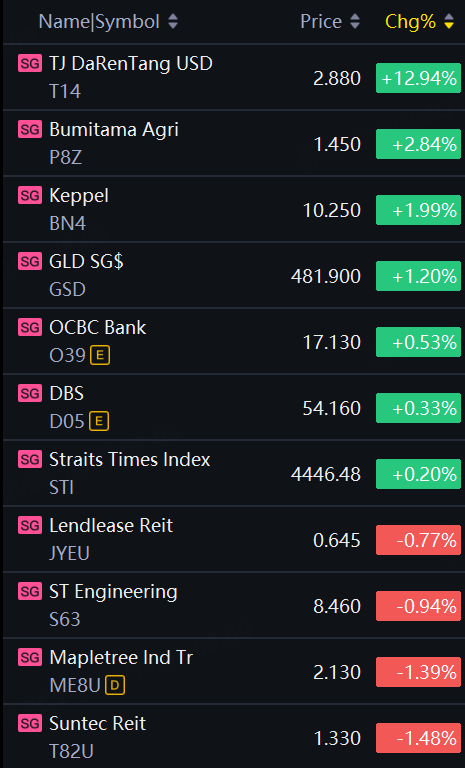 Singapore stocks opened higher on Friday. STI rose 0.2%; TJ DaRenTang up 13%; Bumitama Agri up 3%; Keppel up 2%; ST Engineering, Mapletree Ind Tr down about 1%.