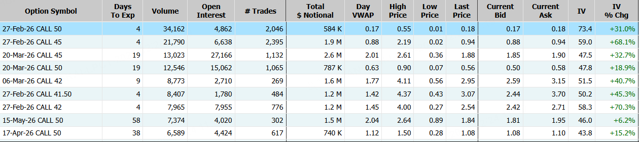 PayPal隔夜涨超5%,期权合约成交37.27万张,较90日均量放大2.3倍。2月27日到期的50美元的行权看涨期权交易量特别高,共有34,162份合约交易。 $PYPL 20260227 50.0 CALL$