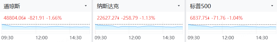 周一(2月23日),美股三大指数集体下跌。截至收盘,标普500指数跌1.04%,报6837.75点;纳斯达克综合指数跌1.13%,报22627.27点;道琼斯工业平均指数跌1.66%,报48804.06点。