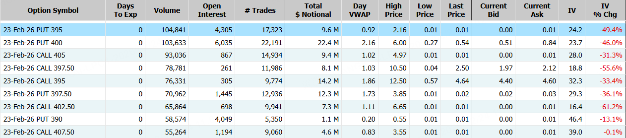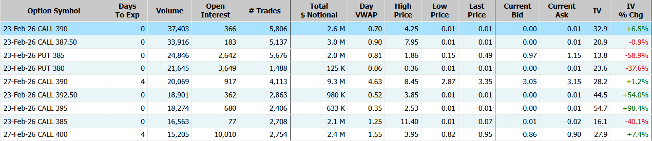 微软期权合约成交107.24万张,2月23日到期的390美元的行权看涨期权交易量特别高,共有37,403份合约交易。