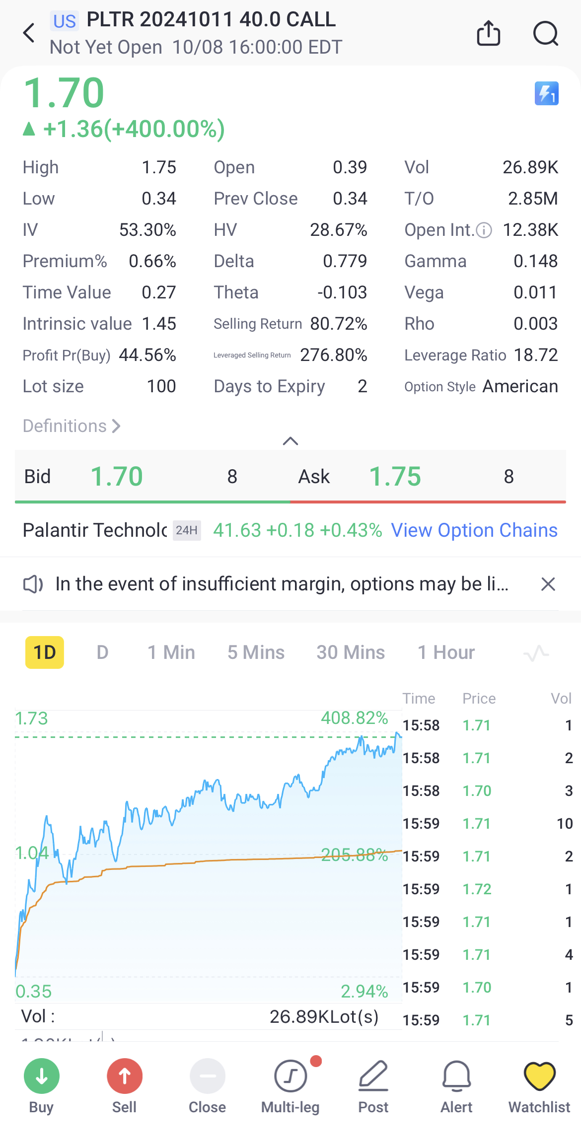 A total number of 684.51K options related to Palantir was traded, of which 60% were call options on Tuesday. A particularly high trading volume was seen for the $40 strike call options expiring this Friday, with 26,889 options contracts trading. The $40 strike call option expiring this Friday surged 400% on Tuesday. $PLTR 20241011 40.0 CALL$