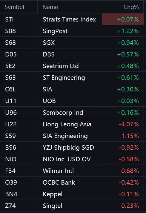 Singapore stocks opened higher on Wednesday. STI rose 0.1%; SingPost rose 1%; SGX rose 0.9%; DBS rose 0.6%; Seatrium rose 0.5%.