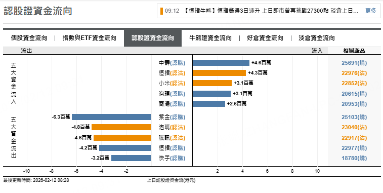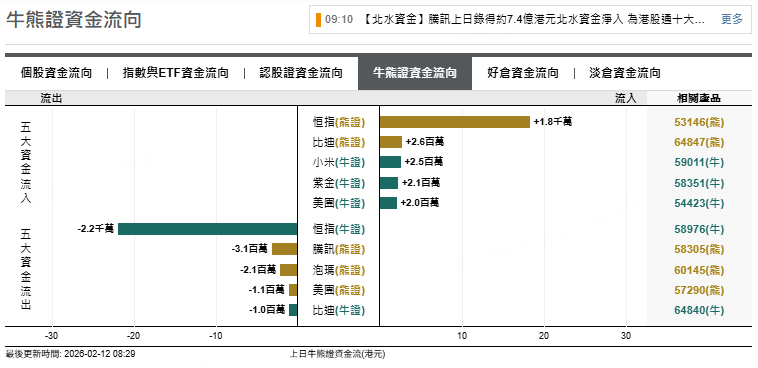 恒指牛證上日流出2200萬元,騰訊熊證上日流出310萬元,泡瑪熊證流出210萬元。