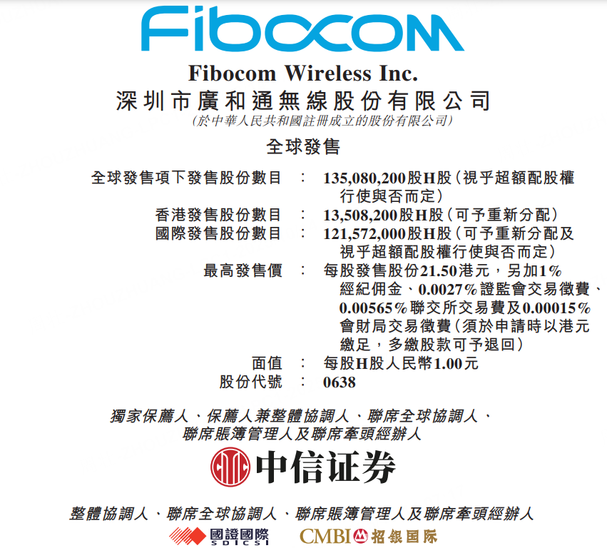 10月14日,广和通于10月14日至10月17日招股,公司拟全球发售约1.35亿股H股,其中,香港发售占10%,国际发售占90%,另有超额配股权15%。每股发售价19.88港元-21.5港元,每手200股,预期H股将于10月22日在联交所开始买卖。