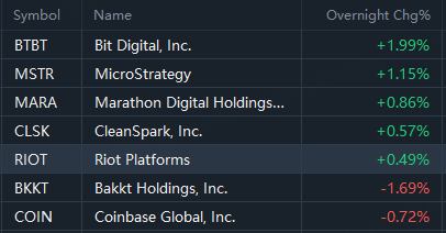 Crypto stocks mixed in overnight trading. Bit Digital rose 2%; MicroStrategy, Marathon Digital rose 1%; Bakkt fell 1.7%; Coinbase fell 1%.