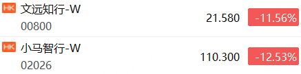 美股夜盘时段,文远知行、小马智行均跌超3%。