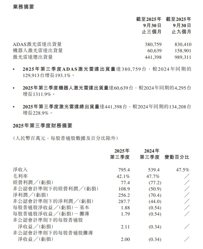 禾赛:2025年三季度净收入7.95亿元,同比增长47.5%;净利润2.56亿元,去年同期净亏损7040万元;经调整净利润2.88亿元,去年同期经调整净亏损4400万元。