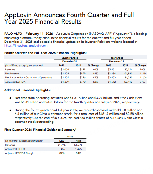 2月12日, AppLovin Corporation 公布Q4财报,其中营收不及预期,盘后股价跌超6%。