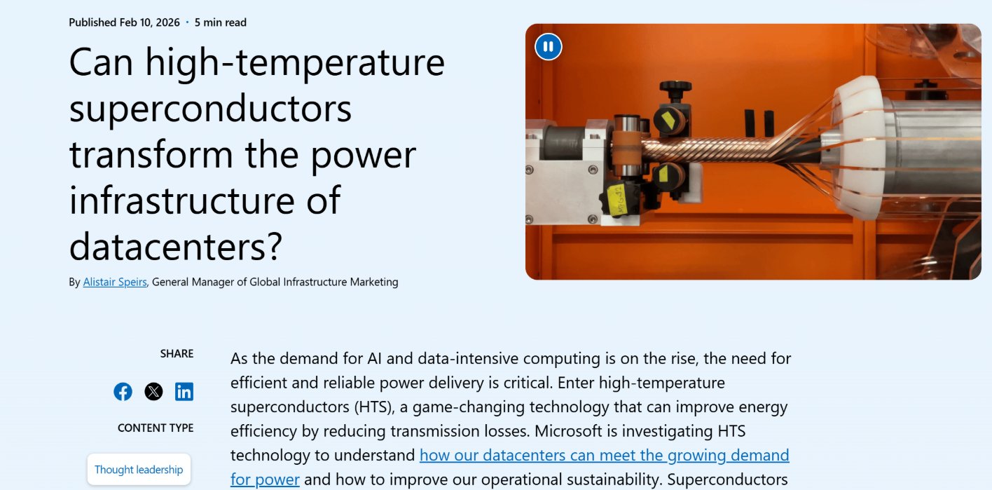 微软在最新官方博客中披露,正评估将高温超导(HTS)电缆引入数据中心供电体系,以降低损耗、压缩体积并提升电力密度,缓解AI算力扩张下的基础设施约束。该方向一旦落地,或将重塑数据中心电力架构,并对超导材料、先进电网及核聚变产业链形成长期拉动。