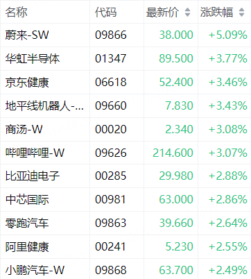 科指成分股中,蔚来-SW涨5.09%,华虹半导体涨3.77%,京东健康涨3.46%,地平线机器人-W涨3.43%,商汤-W涨3.08%。