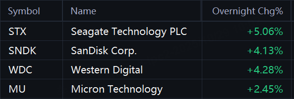 Other data storage companies also gained in overnight trading. SanDisk and Western Digital rose 4%; Micron Technology rose 3%.