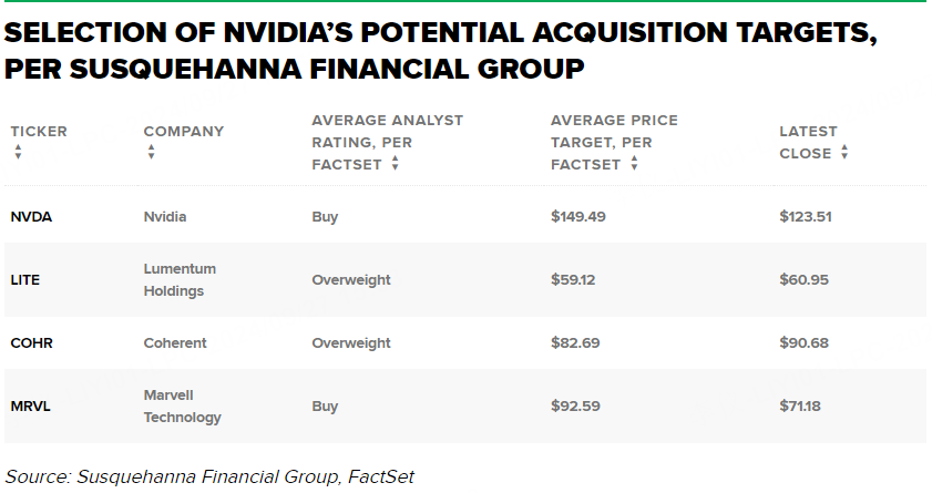 光学和光子产品制造商 Lumentum Holdings Inc. 、工程材料和光电子元件制造商 COHERENT 以及半导体生产商Marvell Technology是罗兰德列出的几个潜在的英伟达收购候选公司。当然,英伟达尚未表示正在积极考虑收购这些公司中的任何一家。