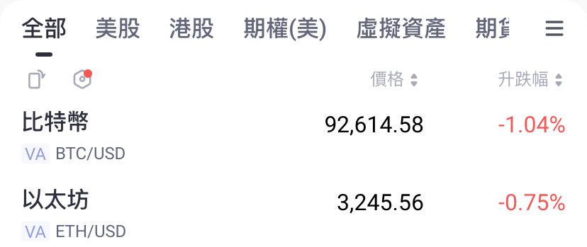 Tiger Trade行情显示,BTC跌破93000美元,现报92615美元,24H跌幅1.04%;Tiger Trade行情显示,ETH继续维持3200美元价位,现报3246美元/枚,日内跌幅0.75%。