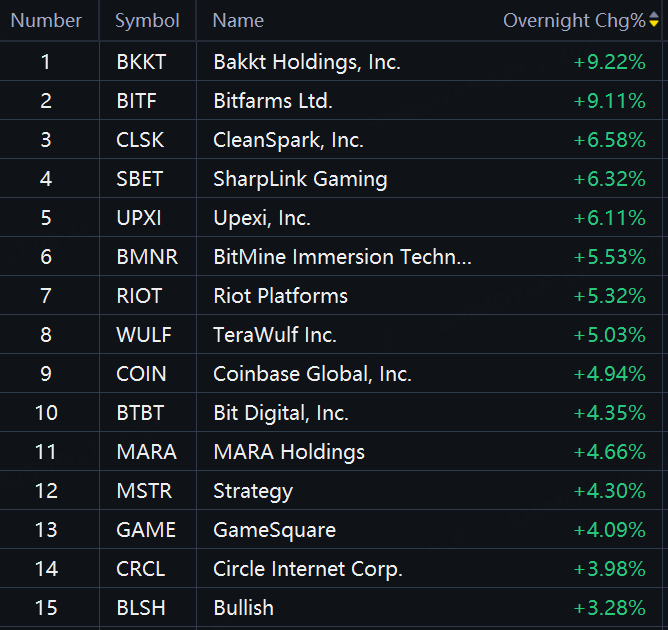 Crypto stocks jumped in overnight trading. Bakkt Holdings, Bitfarms up over 9%; CleanSpark, SharpLink Gaming, Upexi up over 6%; BitMine, Riot Platforms, TeraWulf up over 5%.