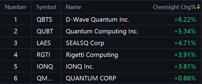 Quantum shares jumped in overnight trading. D-Wave Quantum up over 6%; Quantum Computing, SEALSQ up around 5%; Rigetti, IONQ up about 4%.