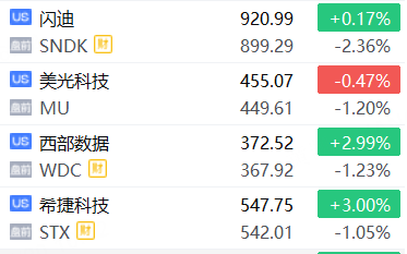 存储概念股回调,闪迪跌超2%,希捷科技、美光科技、西部数据跌超1%;