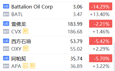美股石油股盘前上涨,Battalion Oil涨超13%,阿帕契涨超3%,西方石油涨超2%,墨菲石油、雪佛龙涨超1%;
