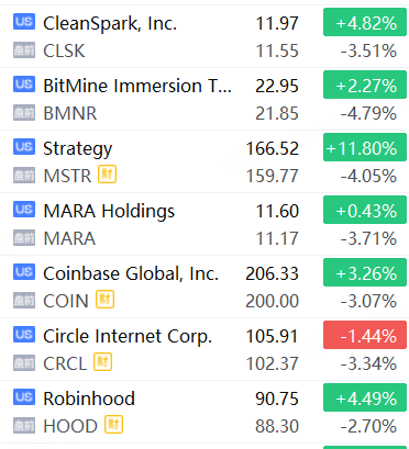 加密货币股盘前普跌,Strategy、 BitMine Immersion Technologies Inc.跌4%,Coinbase Global, Inc.、Circle、Cleanspark跌超3%, Robinhood跌超2%;
