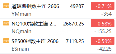 4月20日,美股三大股指期货下跌,截止发稿,道指期货跌0.71%,纳指期货跌0.58%,标普500指数期货跌0.59%。