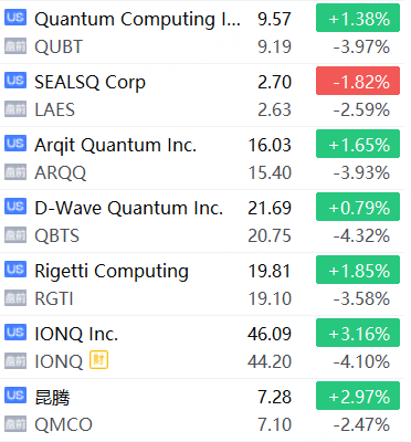 量子计算概念股下跌,D-Wave Quantum、IONQ跌超4%,Arqit Quantum、Quantum Computing、Rigetti Computing跌超3%,SEALSQ、昆腾跌超2%。