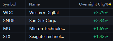 Chip storage stocks jumped in overnight trading. Western Digital up 4%; SanDisk, Micron up 2%; Seagate up 1%.