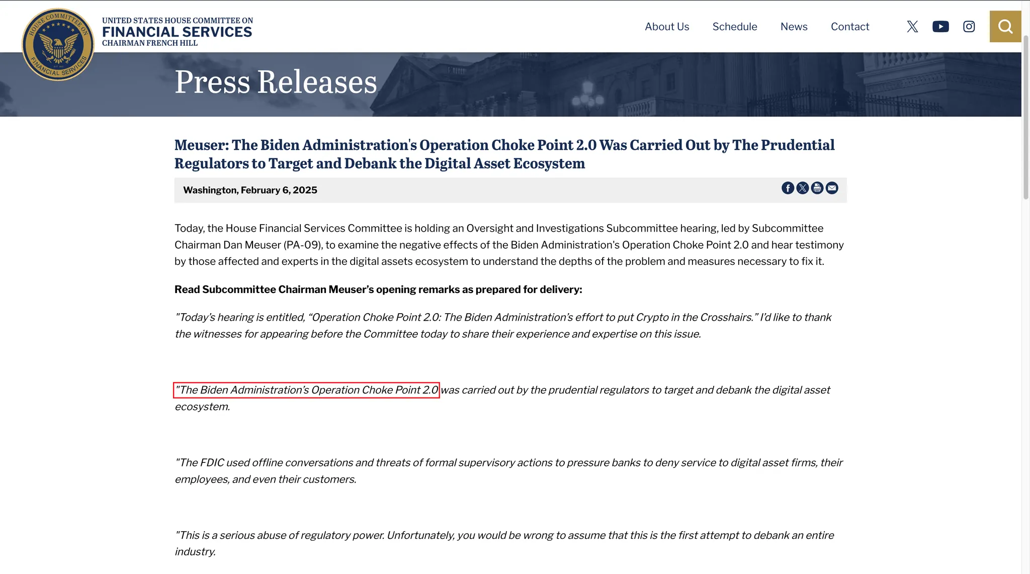 这一阶段被行业内部称为「去银行化」,也被部分议员形容为「Operation Choke Point 2.0」。根据众议院金融服务委员会后续调查,多家银行在非正式监管压力下,切断了与加密企业的合作。Silvergate Bank 与 Signature Bank 的相继退出,是这一趋势的集中体现。