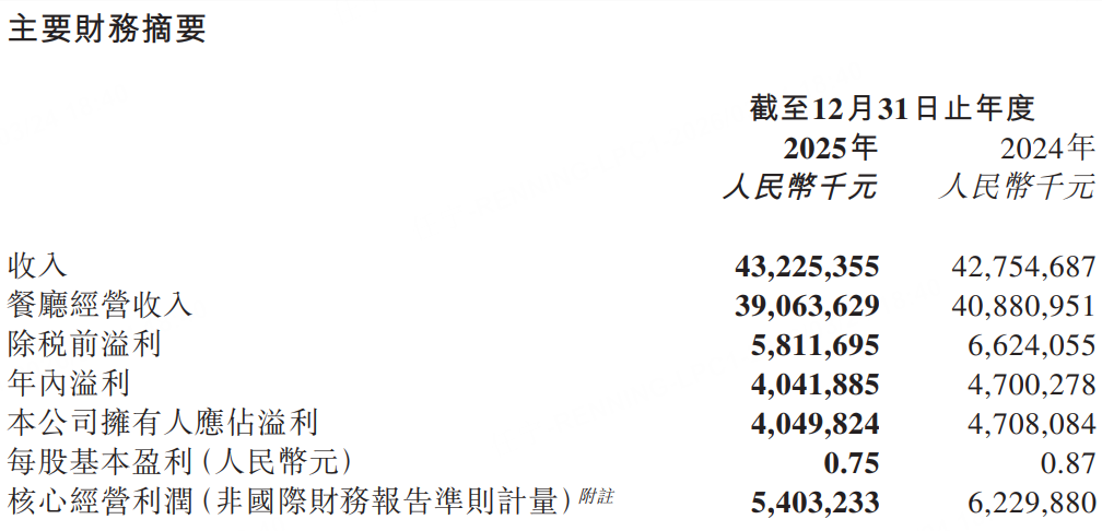 海底捞 公告:2025年,本集团收入为人民币432.25亿元,同比增长1.1%;核心经营利润为54.03亿元,同比下降13.3%;年内溢利40.42亿元,同比下降14.0%,利润下降主要受翻台率下降,以及产品、场景等创新模式方面的调整影响。