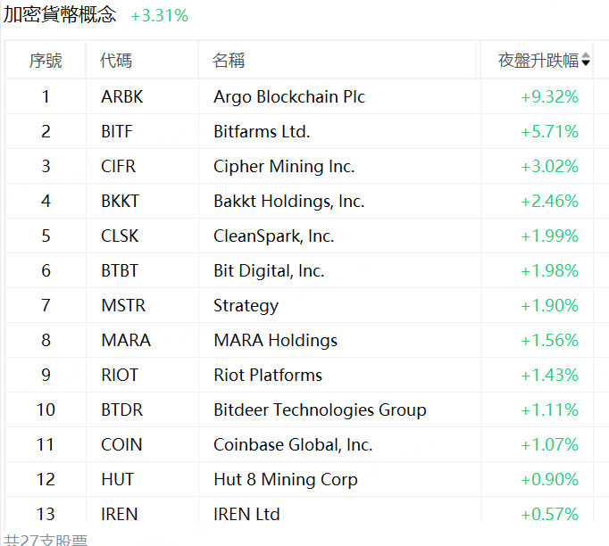 比特币重返11.9万美元关口,加密货币概念股夜盘上扬, Argo Blockchain Plc 涨9%,Circle、Strategy、MARA、BMNR涨近2%,Coinbase、 CleanSpark, Inc. 涨逾1%。