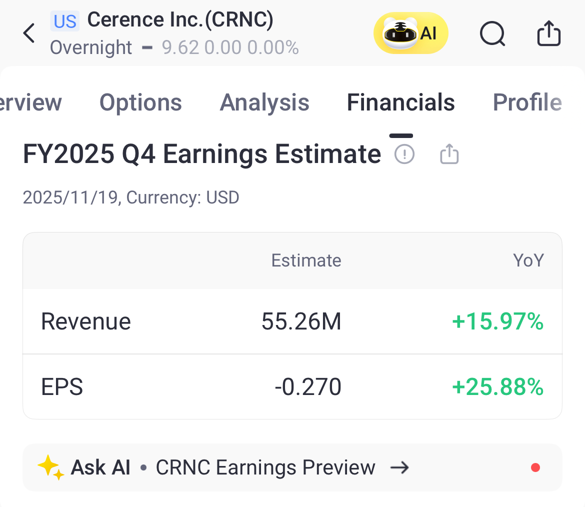 Cerence Inc.(CRNC)将在2025年11月19日(美股盘后)发布最新季度财报,市场关注营收修复的可持续性与利润率改善路径,以及AI座舱相关订单转化节奏。