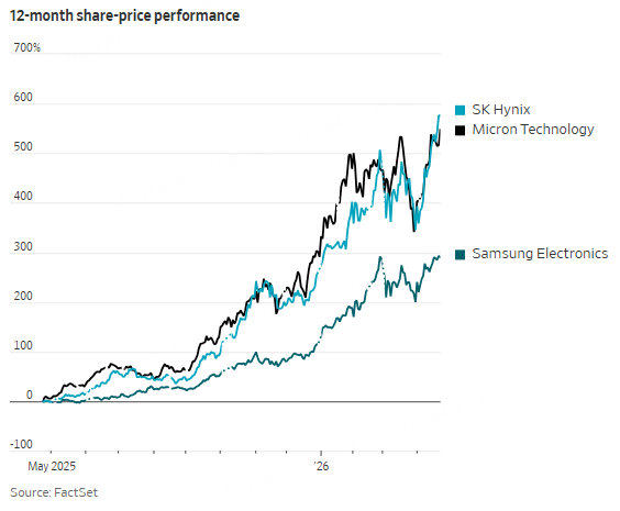 Memory stocks have posted large gains recently, leaving some analysts concerned about market froth. Sandisk is the S&P 500’s best performer this year, up nearly 300%. In Korea, Samsung shares are up 83%.