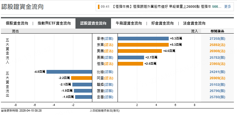 恒指熊證上日流入430萬元,騰訊牛證流入390萬元,美團牛證流入380萬元。