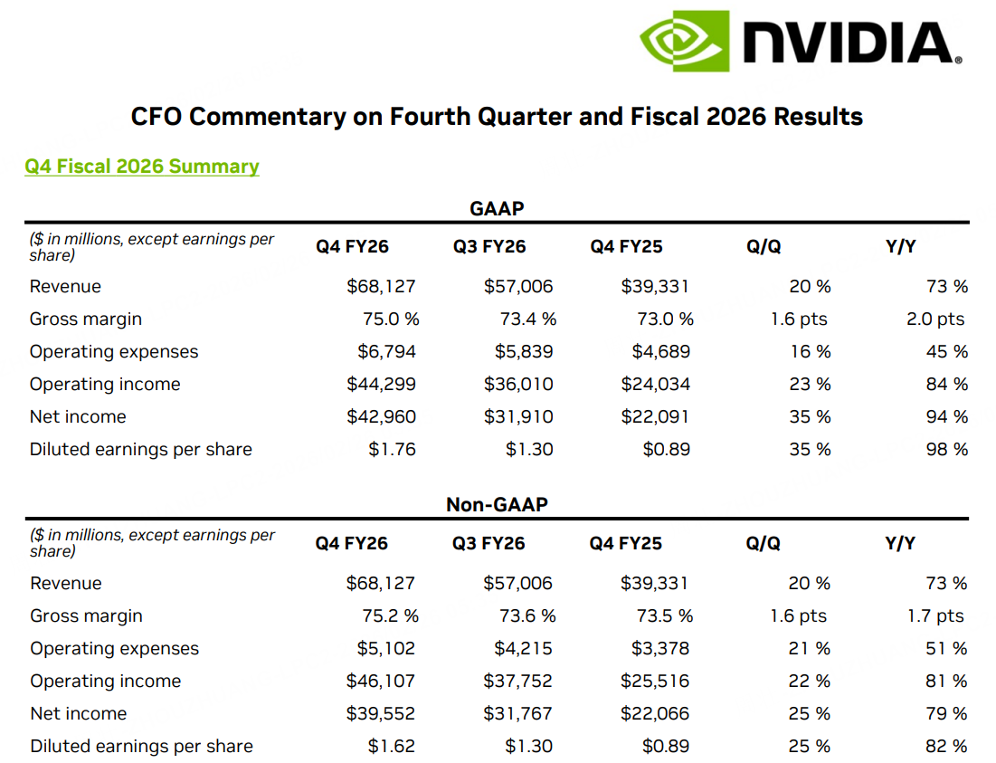2月26日,英伟达发布2026财年第四季度业绩。财报显示,第四季度营收681.27亿美元,创历史新高,市场预期659.12亿美元,上年同期为393.31亿美元;净利润395.52亿美元,同比增长79%;调整后每股收益1.62美元,同比增长82%。