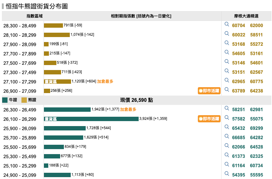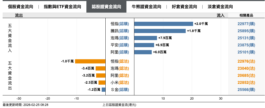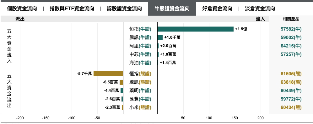 上日輪證資金流反映投資者傾向趁指數下跌部署反彈,恒指好倉錄得約2億港元淨流入,恒指牛 57582/熊 61505