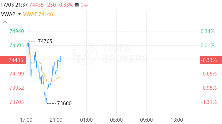 Tiger Trade行情显示,BTC跌至74435美元,24H跌幅0.33%;ETH升至2333美元,日内升幅0.73%。