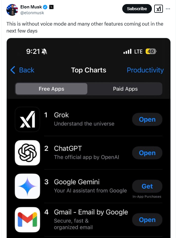 2月20日,马斯克旗下的AI初创公司xAI宣布最新大模型Grok 3免费向所有公众开放。随后,马斯克晒出了一张苹果应用商店免费应用下载排行榜,Grok APP超越ChatGPT应用登顶第一名。