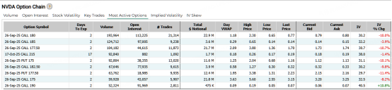 英伟达跌0.82%,期权合约成交量较上个交易日下降超25%至195.67万张。明日到期的180美元看涨期权交易量较高,共有193,964份合约交易。