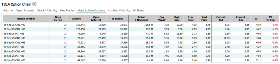 昨日,特斯拉大涨近4%,期权合约成交量大幅增长50%至252.37万张。其中明日到期的440美元看涨期权交易量较高,共有150,643份合约交易。