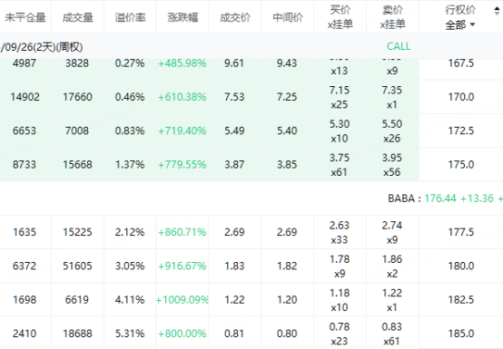 此外,多张明日到期行权价167.5-185美元的看涨期权最低涨超450%。