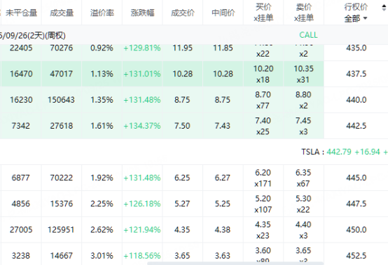 此外,多张明日到期行权价435-452.5美元的看涨期权最低涨幅翻倍。