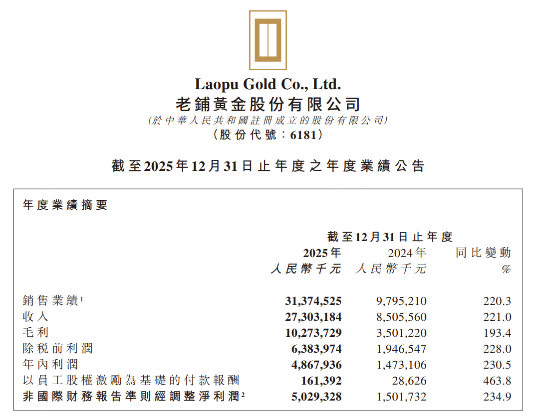 老铺黄金2025全年净利润48.68亿,同比增加230.5%