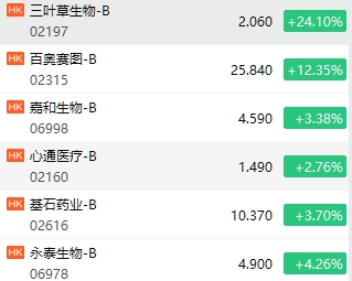 生物医药B类股多数上涨,三叶草生物涨超24%,百奥赛图涨超12%