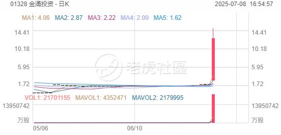 今日,金涌投资放量拉升,该股午后最高触及15港元,涨幅一度超过650%。截至收盘时,公司股价上涨533%报12.6港元,成交额超过2亿港元,最新市值为32亿港元。