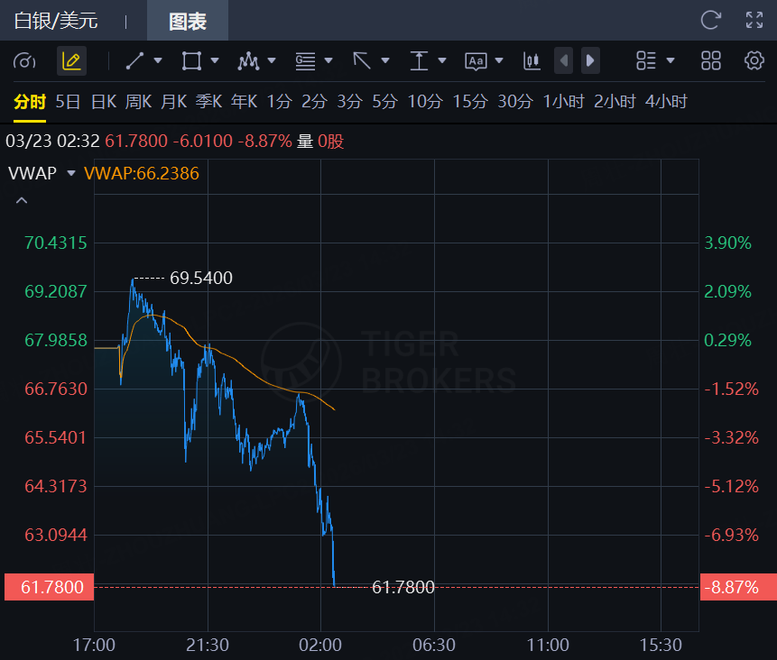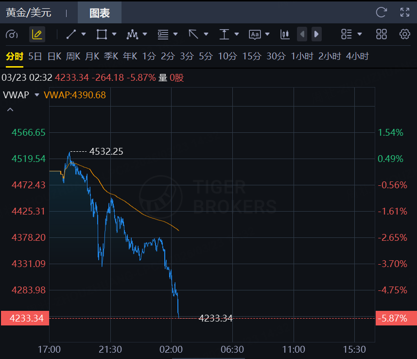 3月23日,国际贵金属价格持续下挫,现货黄金跌至4250美元/盎司下方,日内跌超5%;现货白银跌至62美元/盎司下方,日内跌超8%。