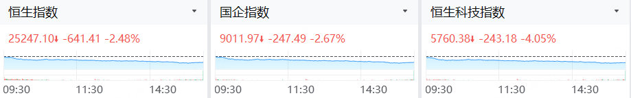 港股三大指数全天呈现单边下跌行情,恒生指数跌2.48%,恒生科技指数跌4.05%,国企指数跌2.67%。